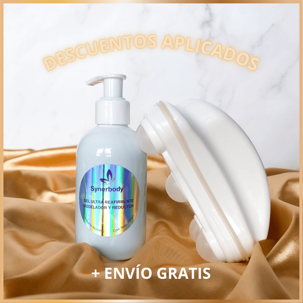 🔸 Gel ultrareafirmante modelador y reductor🔸 Masajeador Synerbody con sistema active-roll, rompe los adipocitos que ablanda la Crema para que sean eliminados por el sistema excretor. De uso manual sin esfuerzo en ducha, volviendo el hábito del masaje fácil de incorporar 🔸 Venda compresora elástica 10cm x 4mt: Comprime y evita flacidez junto a la acción de los productos. Hipoalergénica. Calidad premium. Reutilizables. Aumenta la microcirculación y potencia efecto antiinflamatorio. Disminuye edemas mientras los productos trabajan. Utilizar 15 minutos es suficiente.
